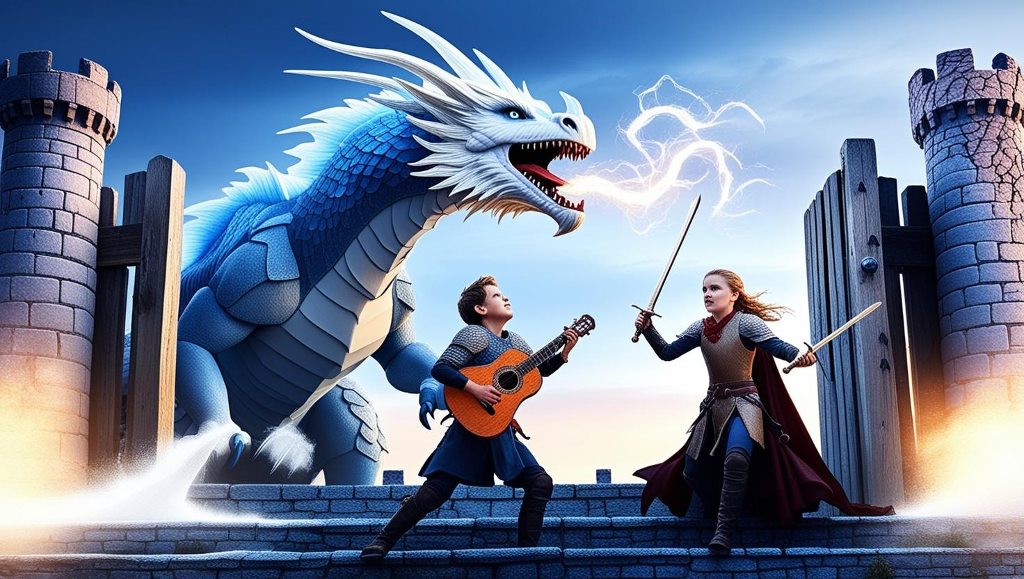 Les combattants glacés volent en éclats. Vu l'état du combat, Miro et Lotus décident de se joindre à l'affrontement, même s'ils ne sont pas des guerriers. Miro sort sa guitare électrique de son étui et joue de la musique. Le son immobilise le dragon. Pendant ce temps, sa petite sœur saute sur le monstre ailé, elle court sur son dos et le décapite avec ses katanas. Dans un dernier souffle de vie, le dragon les projette d'un coup de son aile dans la forêt. Lotus atterrit sur ses pieds tandis que son frère tombe sur le ventre.